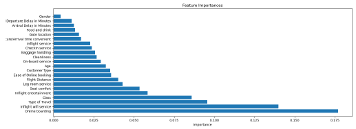 이 분석에서 사용된 랜덤 포레스트(Random Forest) 모델은 다수의 의사결정나무를 활용하여 예측을 수행하는 앙상블 학습 기법으로, 단순히 분류 정확도가 높을 뿐만 아니라, 각 변수(피처)가 예측 결과에 얼마나 기여했는지를 수치화하여 도출할 수 있는 장점을 갖고 있습니다. 즉, 모델이 어떤 항목을 더 중요하게 인식했는지를 바탕으로, 결과에 영향을 미친 핵심 요인을 해석할 수 있다는 것입니다. 이러한 변수 중요도(feature importance) 분석은 단순한 기술적 지표를 넘어서, 비즈니스 전략 수립에 있어서 매우 실질적인 인사이트를 제공할 수 있습니다. 어떤 서비스 요소가 승객 만족도에 더 큰 영향을 주는지를 파악함으로써, 항공사는 제한된 자원과 예산을 효율적으로 배분하고, 가장 영향력 있는 영역에 집중 투자할 수 있게 됩니다.